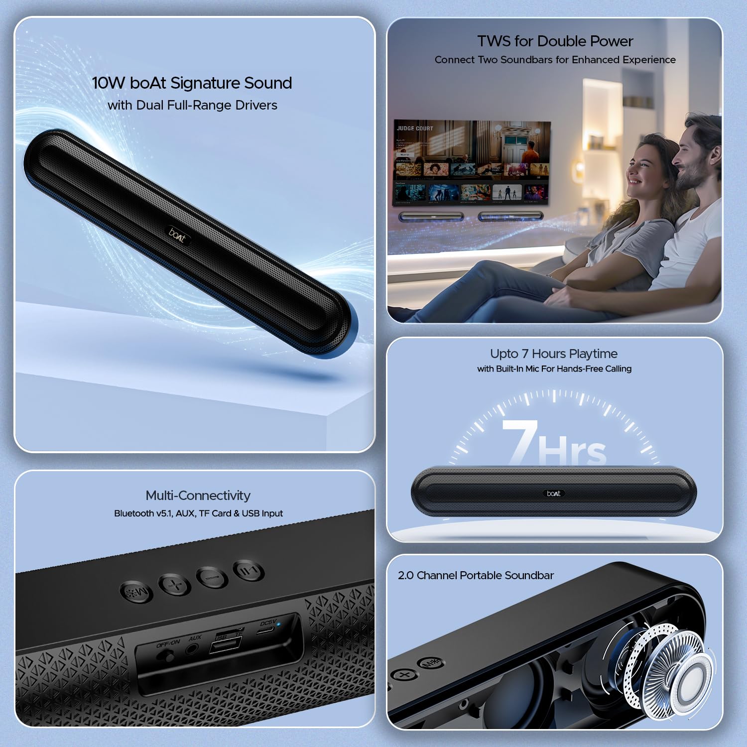 - Impressive Sound: Enjoy crisp and clear audio with 10W RMS of boAt Signature Sound delivered by dual full-range drivers in a 2.0 channel portable soundbar.