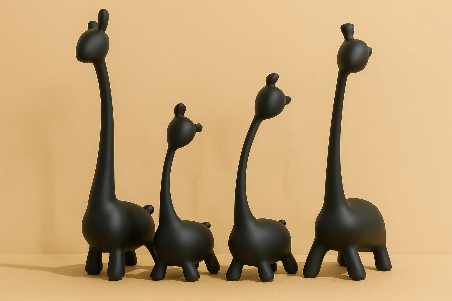 Enhance your home with timeless charm and artistic elegance through this Modern Black Nordic Giraffe Family Figurine Set. Crafted in a sophisticated matte black finish, these four resin giraffes feature clean, minimalist lines that bring a sleek and contemporary touch to any space. The varying heights of the figurines evoke the warmth and unity of family, making them a heartfelt and symbolic decor piece.
