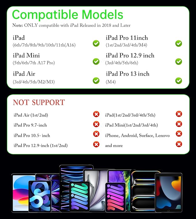 | Compatible Devices | ONLY compatible with iPad 6th/7th/8th/9th/10th/11th (A16) Gen; iPad Pro 11inch (1st/2nd/3rd/4th/M4 Gen); iPad Pro 12.9 inch (3rd/4th/5th/6th Gen); iPad Pro 13 inch M4; iPad Air 3rd/4th/5th/M2/M3 Gen, iPad Mini 5th/6th Gen.【Note】Not compatible with other iPad models or any other brand's touchscreen devices |